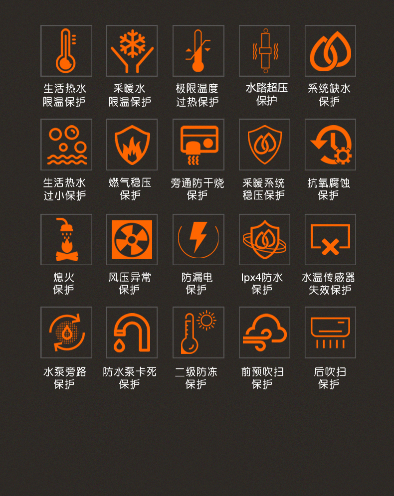 燃氣熱水器一般具備的保護功能有:防意外熄火、防沸騰、燃氣泄露保護等十余項,壁掛爐安全保護功能則更多,如菲思盾壁掛爐還涵蓋風壓保護、供暖系統過壓保護、安全泄壓、自動排氣、煙道堵塞保護等多重防護措施,遵從“安全采暖”宗旨,讓用戶能夠放心使用。