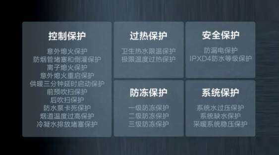 基本的安全功能是必不可少的:自動診斷、漏電保護、缺水保護、防凍保護、水泵防卡死保護、水泵旁路保護、水流量監(jiān)控裝置、防干燒和超溫保護、供暖系統(tǒng)過壓安全保護、熄火保護、水溫傳感器失效保護等等。
