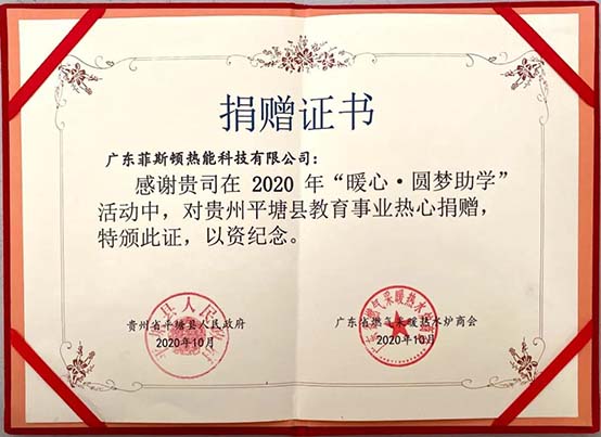 廣東菲思盾熱能科技有限公司作為燃?xì)獗趻鞝t行業(yè)的標(biāo)桿,肩負(fù)著社會(huì)責(zé)任,在企業(yè)快速發(fā)展的同時(shí),始終秉承樂(lè)善好施的傳統(tǒng)美德,樂(lè)于奉獻(xiàn)回報(bào)社會(huì)。