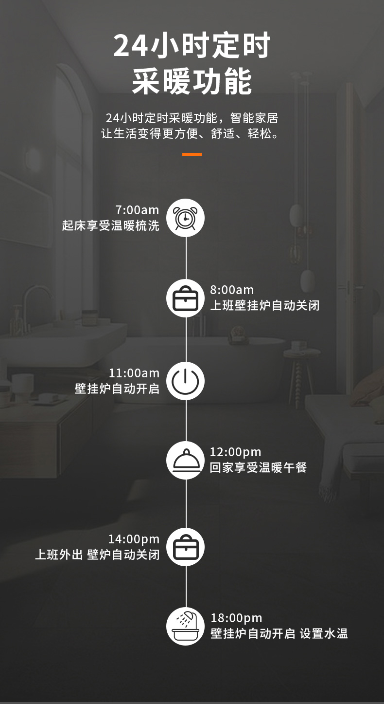 自定義定時采暖功能,可滿足不同場景和人群的個性化采暖,采暖季比常規模式更節省燃氣。