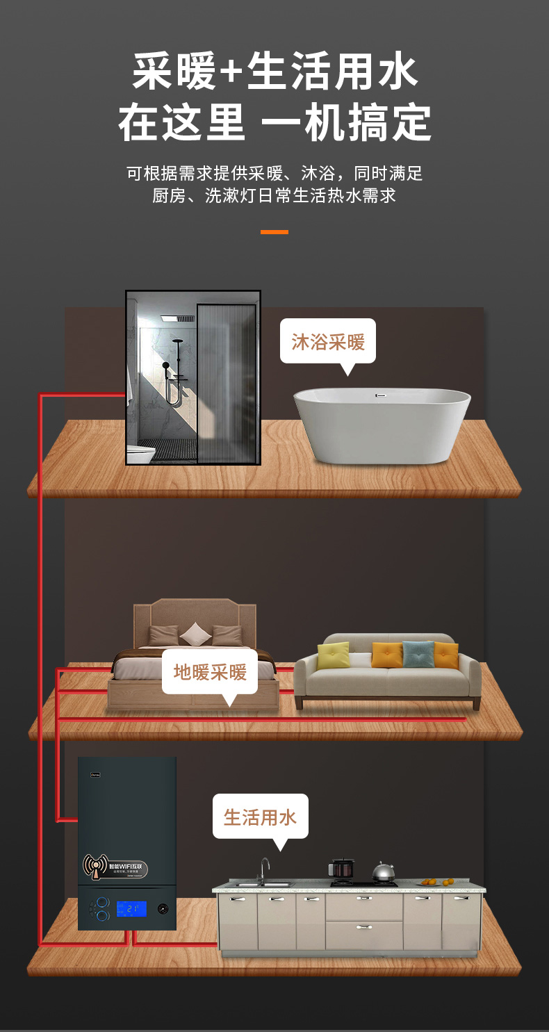 生活熱水自動恒溫,水溫控制精確±1℃,避免燙傷和凍感冒。